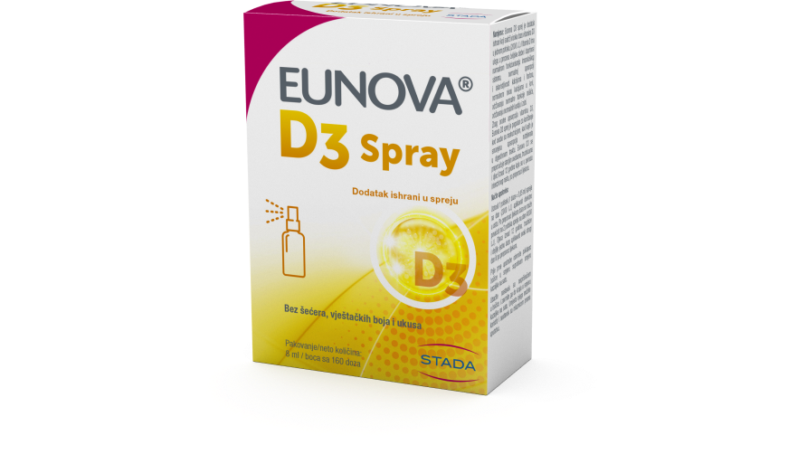 Eunova D3 sprej sadrži 2000 i.j. vitamina D3 u samo jednom potisku spreja i savršeno je rješenje za brzu, efikasnu i praktičnu nadoknadu vitamina D, koji je ključan za mnoge funkcije u tijelu. Vitamin D3 doprinosi normalnoj funkciji imunog sistema, očuvanju normalnih kostiju, zuba i normalne funkcije mišića.