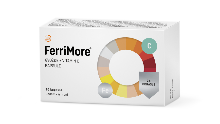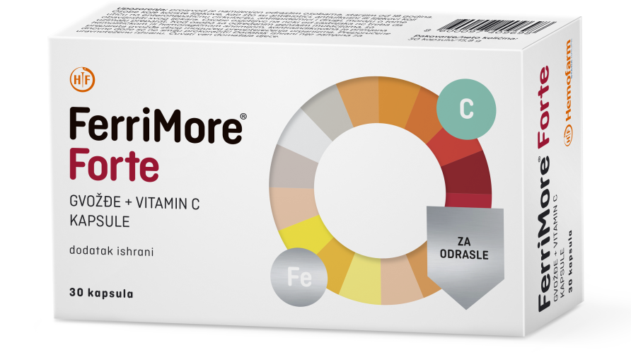 Ferrimore forte sadrži 30 mg željeza u obliku mikroniziranog mikroinkapsuliranog željezo-pirofosfata i 60mg vitamina C.